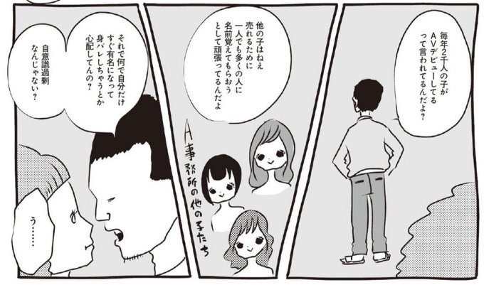 好評発売中『AV女優ちゃん』3巻!今日の推しコマは、AV出演が周りにバレたらどうしようなんて心配するのは自意識過剰⁉︎ 謎すぎるスカウト理論ですが、納得してしまう人も多いのだとか。取材に基づいたセリフです。