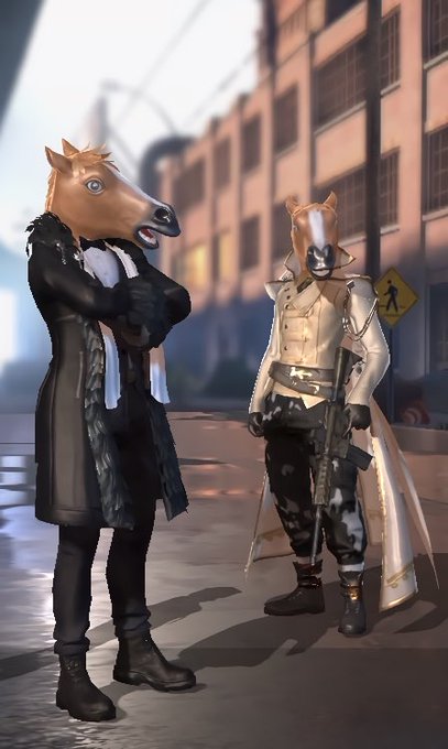 荒野行動のアイコン用に。 いつも着用しているコーデをレインくんに着てもらいました🐴 レイン×荒野行動 (上海灘コーデ with 馬マスク)
