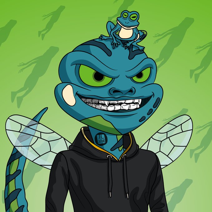 This is so sick! @TheCyberHornets Made me a special 1/1 hornet based off my genesis frog!! love the details and my logo as a neck tattoo! Thank you so much and big ups to all you are doing!