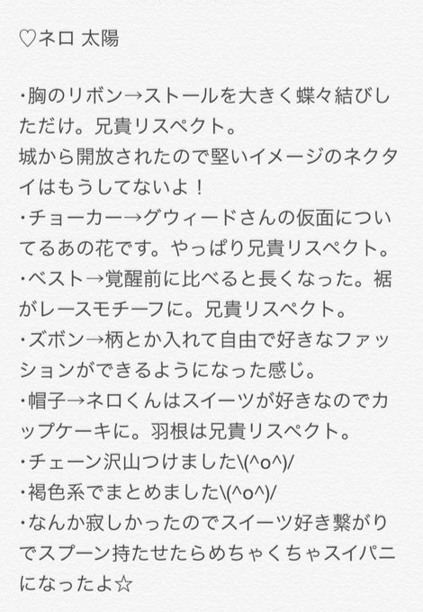 @venus05s ネロ太陽覚醒(私の勝手な妄想)できましたああああ 壊滅的センスですがサキちゃんの助力のお陰で無事完成したよおお!! 太陽はストーリー的にも兄貴を信じる感じになるから要所要所に兄貴要素盛り込んでみたりしたw