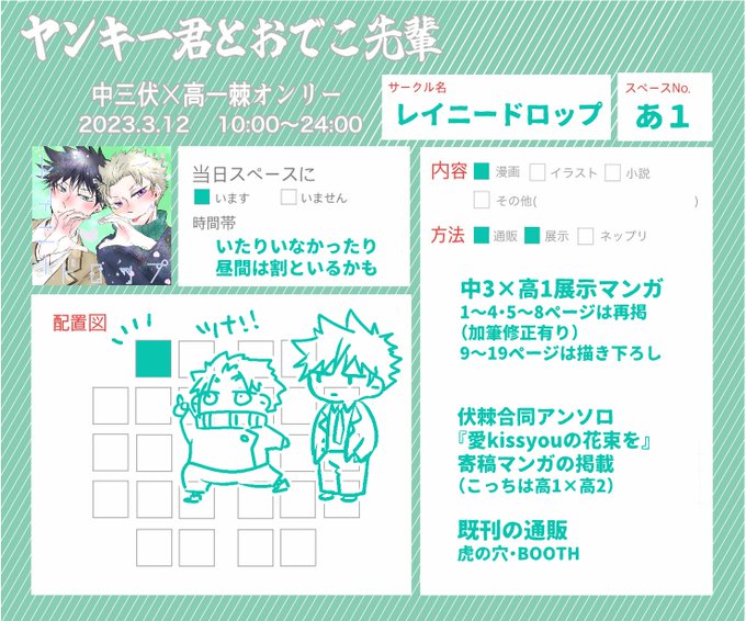 明日のヤンでこ宜しくお願いします🐺🍙 主催のkauさん、Soraさんイベント開催ありがとう・おめでとうございます スペースは「あ1」です。まさかの最初!!!!! 展示はポイピク予定。パスワード設定します。 パスワードはスペースに掲載しますのでイベント会場でご確認下さい。 #ヤンでこ