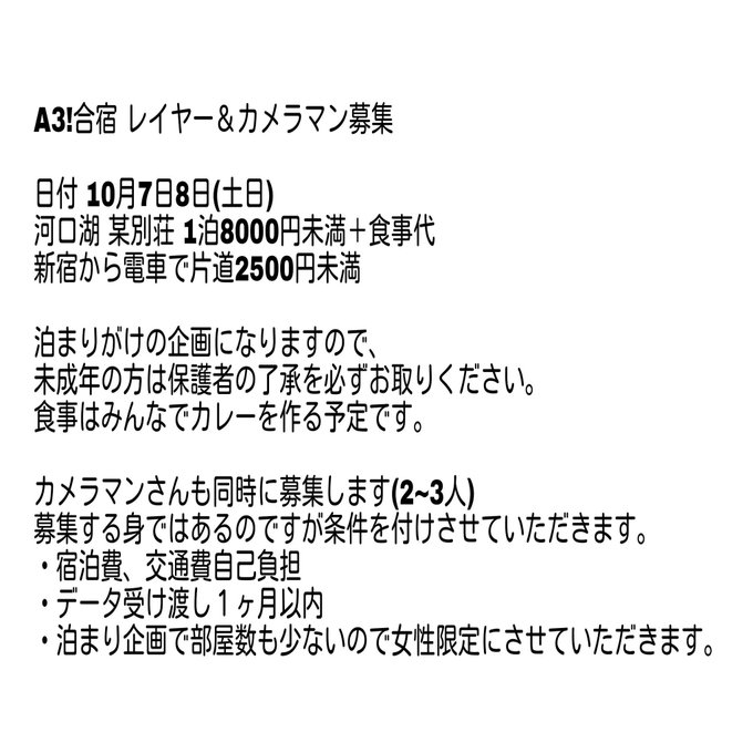10月7日8日A3!合宿 新宿~片道2500円程度 参加費7000円未満 丞とシトロンを切実に募集しています!! #拡散希望