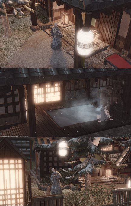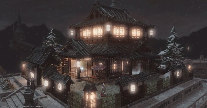 6.3 신규 료칸(온천)풍 외벽 - S 소형 욕탕, 벤치 등 구성이 다양하고 마당도 넓어 보여서 매우 만족...! 동양풍 외벽이지만 지고천 거리에도 잘 어울려요. 추운 지방 료칸 같고...🏔️❄️ (나무, 눈더미, 바닥돌은 별도로 설치) #ff14