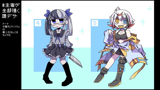 アイシークさん主催の誰デザに参加しました‼️ テーマは『水酸化ナトリウムの擬人化もしくはキャラ化』です! 私が考えたデザはどの子なのか…‼︎リプにアンケート繋げるのでぜひ…‼︎
