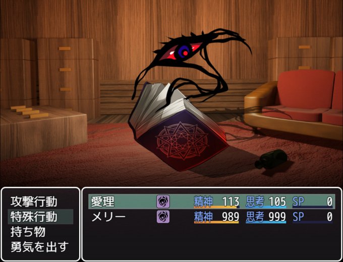 今日微妙に進めた分 左の連中 1Fに行った時に出た会話がヒントになって発見、いつから居たのか 本の アイテム渋ったら負けました、戦闘後の会話からするに容赦なく攻撃アイテムを使っていくのが正しいと思われます 壺の ちょっと強いので見送り、こっちもアイテム使っていかないと厳しそう
