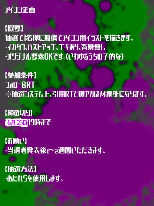 特に理由は無いけどアイコン企画やります〜 当選1名、フォロー&RTで参加、6月23日(水)19時まで ※引用RT、鍵垢はシステム上対象外になります 詳細は1枚目見てください〜 #アイコン企画