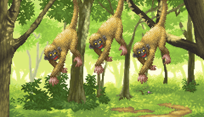 天井から音もなくぶら下がり、下を通りかかった不幸な冒険者からこっそり物をかすめ取り、森の中に消えていくお猿のモンスター #pixelart #ドット絵 #ツクールMV
