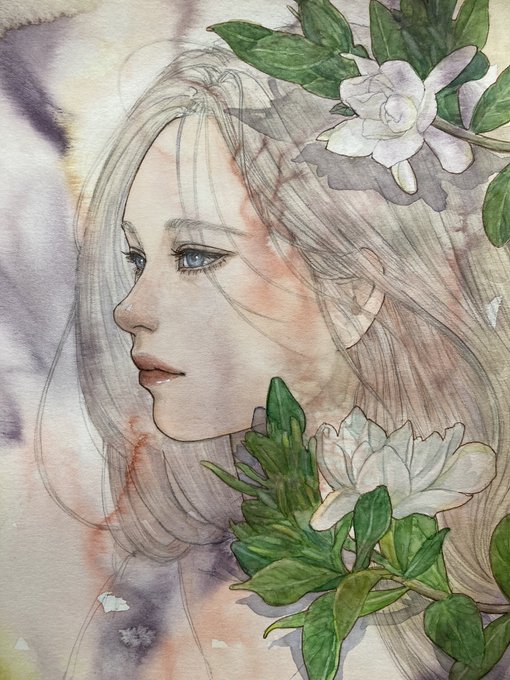 次回の手作り塗り絵用の絵が1枚完成しました☺️今回は人物はあっさり目でクチナシはしっかり塗っています😌白いお花好きだなー☺️