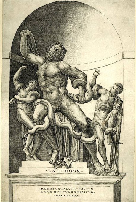 1506年1月14日、ラオコーンとその息子たちの彫刻群が、ティトゥス浴場とネロのドムスアウレアの浴場跡が見つかったエスクイリーノ地域で発見されました。ラオコーン像は12個の破片で発見されました。ミケランジェロがそれを見たとき、彼は驚いて、教皇ユリウス2世にすぐにそれを買うように忠告しました