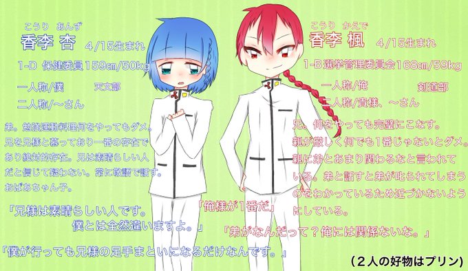 身内企画ばらがく【 @baragakuTL 】に5.6人目失礼します。 1-B香李楓(兄)と1-D香李杏(弟)です。香李兄、香李弟と呼んでください。 なにかとめんどくさい双子ですがよろしくお願い致します〜 #ばらがく