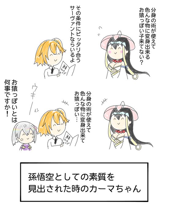 間に合いました_(:3 」∠)_ カーマちゃんお猿っぽくはないけど、孫悟空っぽさは有る( ˘ω˘ )あとカーマちゃんの赤面顔は尊い。