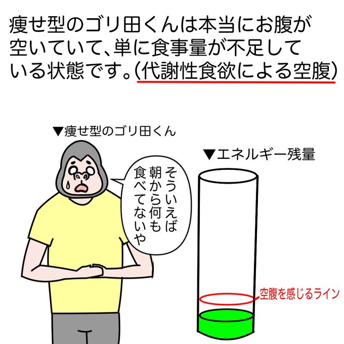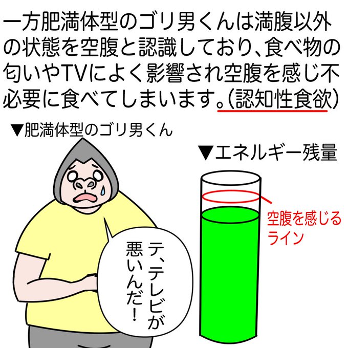 食欲には「代謝性食欲」と「認知性食欲」が存在し「認知性食欲」は体が本来エネルギーを必要としていない時でも食欲をかき立てます。