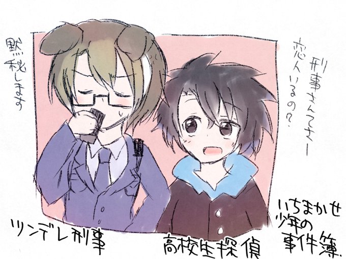 自創作パロディはいいぞ。狗神刑事らくがき。厳しくて優秀な刑事だけど一番合戦少年に調子を崩されてばかり。ミルク大好き。実は子供舌だけど無理して缶コーヒーを飲んでる。眼鏡は童顔を隠すための伊達眼鏡………とかだといいな #一番合戦少年の事件簿