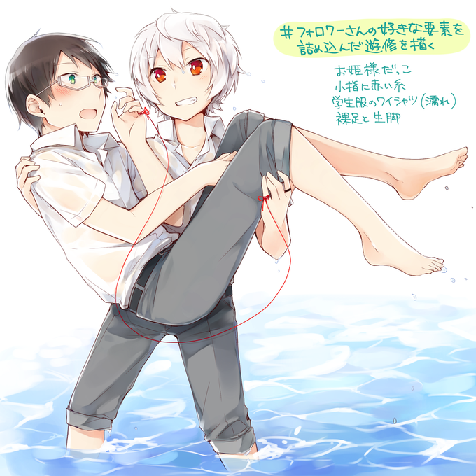 放課後に制服のまま海か川で水遊びしてる遊修ちゃんイメージ(*´∀`) お姫様だっこ/小指に赤い糸/学生服のワイシャツ(濡れ)/裸足と生脚でした、リプありがとうございました! #フォロワーさんの好きな要素を詰め込んだ遊修を描く