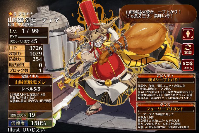 アイギス今月の育成。帝国強化スペシャル枠ということで今回はレベリングも完了済み。ジーク分岐はやっぱ火力特化でしょ、エレオノーラ分岐は甲乙つけ難かったので絵で選択。戦力増強といえば料理人ですわよねと、どれほどインフレしても一番大事なのはコスト役ですよねというチョイスとなりました。