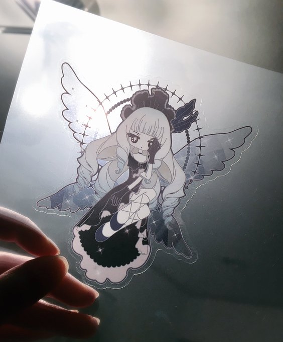 #芸カ12 頒布物そのに、大変遅くなりましたが、絶対零度💎リリエンヌクリアステッカーです〜…! 羽根のところがクリアになってます、ちょっと分かりづらいですが見本でクリアファイルに貼ってみました
