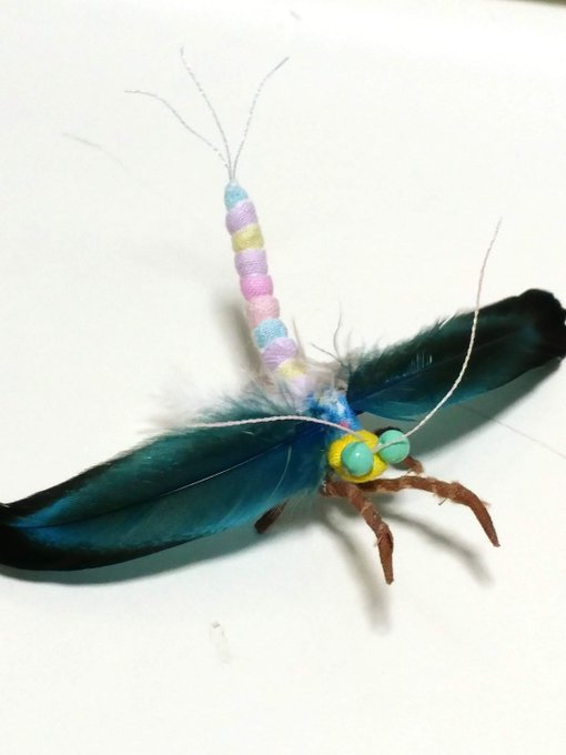 6日目は虫さんでした! 一応これは蜉蝣イメージで作りました。 翅が鳥の羽なのがチャームポイントです✨そしてこだわりは尾っぽをぐいっと上げているところです。
