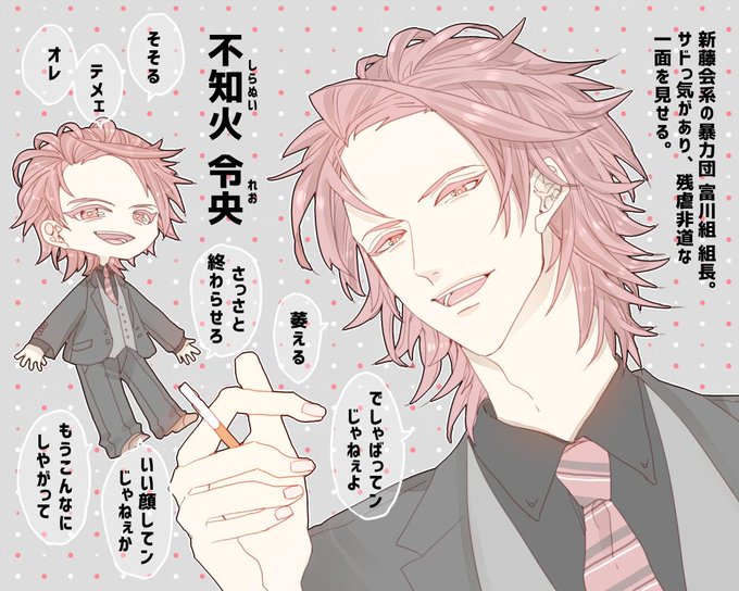 不知火 令央(しらぬい れお)184cm 35歳 新藤会系の暴力団「富川組」の組長。女の子も殴れるタイプ。最近のお気に入りは悠一さんで、足繁くホストクラブ凛音に通っている模様。