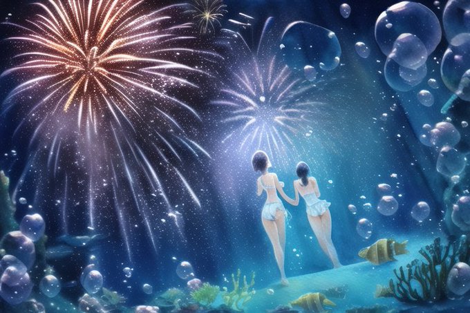 水彩が強めの画風で水中に花火が上がっているイラストを描いてもらいました。backshot指定をしないと人物が崩れがちなのですが、絵文字の🏊とlargeサイズ指定で安定したプロンプトです。1枚目と3枚目に設定記載しています #NovelAI #NovelAIDiffusion