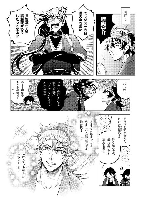最後のコマがこの本一番のお気に入り(実弾入ってて畳に穴空いた)でした☺️骨喰はこの3年肥前を笑わせるのに失敗してるので、ここぞとばかり「笑え!!!」という圧をかけてる。まぁ中身陸奥守なんだけど…