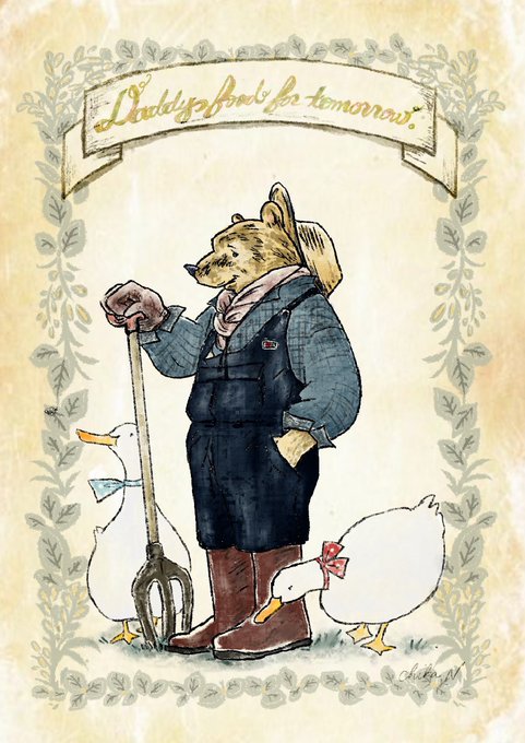 創作絵本にも出てくる予定の、畑のクマのおじさんをモデルに描いた作品です。強面で寡黙な性格ですが、畑で出来た野菜を森の住民たちに分けてくれます。2羽のアヒルも仕事仲間。