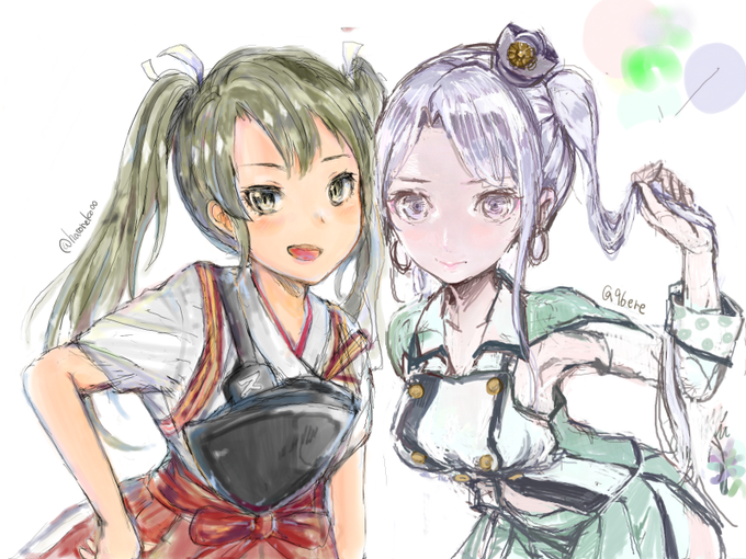 はとねこ(@hatoneko00)さんとPixiv絵チャでイチャイチャ!チュッチュ♪しました(現実は必死で無言作業でした)#艦これ より秋津洲(黒)&瑞鶴(は)を描いたよ!