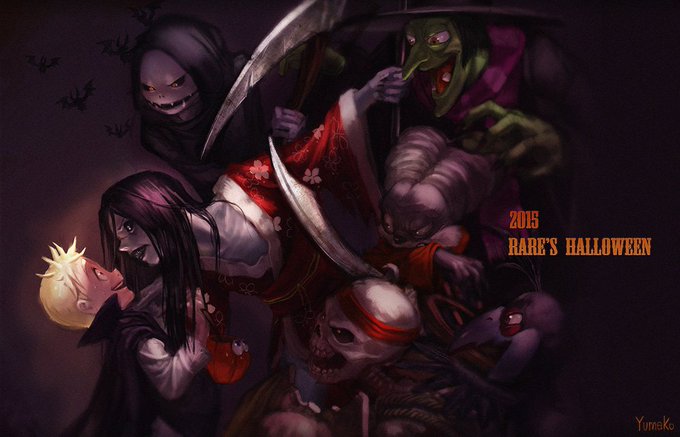 レア社ハロウィン2015イラスト! この季節、今までグーリーズばっか描いてましたけど、今回はRAREREPLAY発売もあってレアのホラーキャラ集合で!そして新たにヒサコさん追加!間に合ってよかった・・ #RareReplay