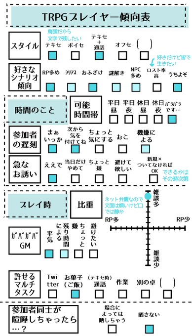 ⊿プロフ+自探まとめ https://t.co/qYgEM6lr6q ⊿回りたい・回したいシナリオ https://t.co/mHmbRNKTwK #TRPG自己紹介シート