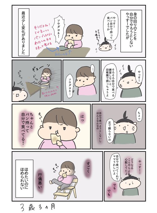 食べてるときにダーイスキとか言って隣に座るわたしに抱きついてくるのとかかわいい。わたしの手を介してパン食べるとかもほんとはすごくかわいくてたまらない #3歳 #育児漫画