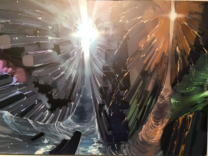 『株式会社カラー10周年記念展』 「シン・エヴァンゲリオン劇場版:||」イメージボード。ロンギヌスの槍を手に歩む初号機。右下は第10使徒に取り込まれた綾波レイか。4色の光は並行世界を指すのかも。#khara #エヴァ #シン・エヴァ
