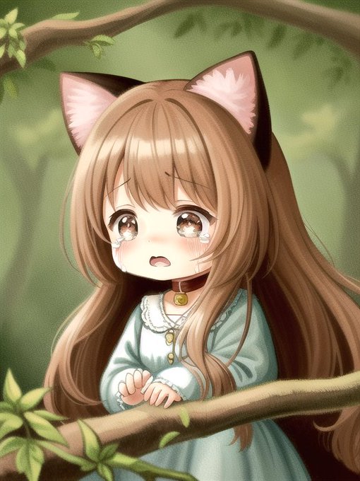 木の上で泣くネコの女の子