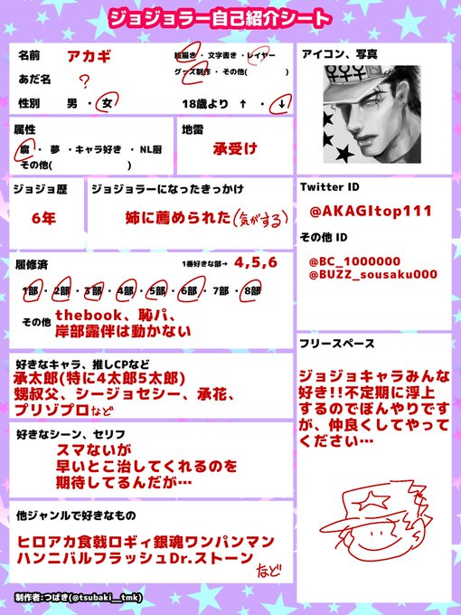 #ジョジョラーさんと繋がりたい #ジョジョ好きさんと繋がりたい 絵が増えたので~!! 承太郎推し、承攻め固定で生きてます! RT中心に❤️もまわります✨ 無言フォローでお迎えいくので 誤反応にご注意ください!