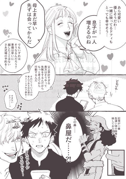 双方記憶なしドフウソ🦩🤥 「🦩兄様……この方の友人に麦わら帽子を被ったり緑髪だったりぐる眉だったりする男性とオレンジ髪の女性など…」 「? 全員いるが」 「……なるほど」