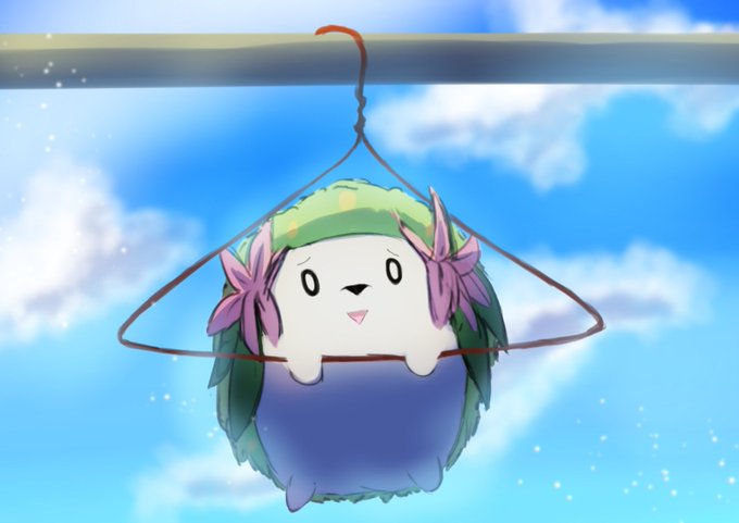 #ポケモン版深夜の真剣お絵描き60分一本勝負 ハンガーにぶら下がるシェイミ ちょうど今日シェイミぬいをお風呂に入れてあげたので
