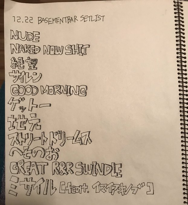 12/22ワンマンライブ「NAKED NOW SHIT」遅ればせながら当日のセットリストです!手描きなけなしフォントver.でどうぞ。