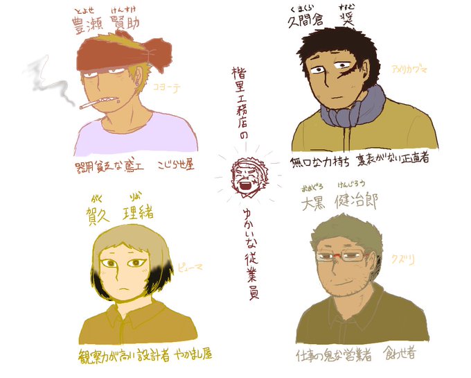 これは誰デザが公開されるまでに描いた落書きです 従業員の名前は未定だけども、各自の役割やかなめちゃんの性格など色々考えていたり