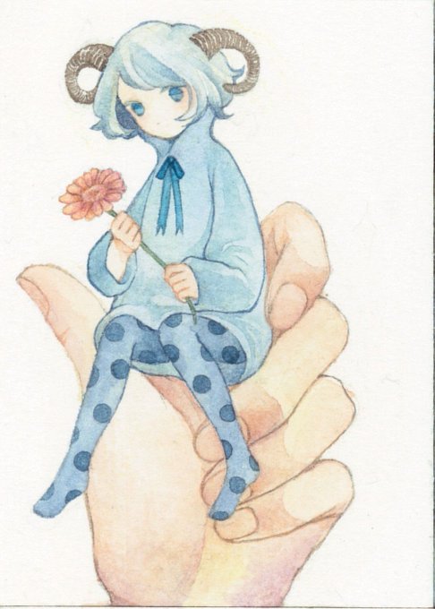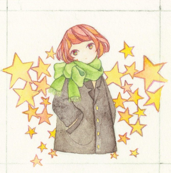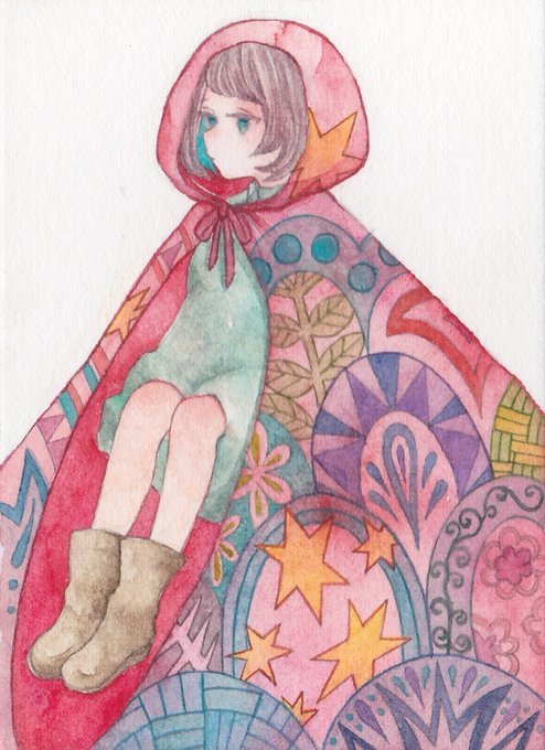 主人公の女の子が善人過ぎて私ではそのあたりの要素を表現しきれませんでした。なるべくやわらかい感じが出るように、水彩らしい塗りを目指しました。手元の星には少しアクリル絵の具の白を使用しています。
