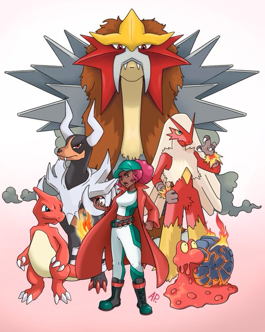 FINALLY painted Red's (my OC) pokemon team! im also drawing a primal Groudon as a representation of HER. im excited #pokemonteam #Houndoom #Charmeleon #Magcargo #Blaziken #Entei #pokemonfanart
