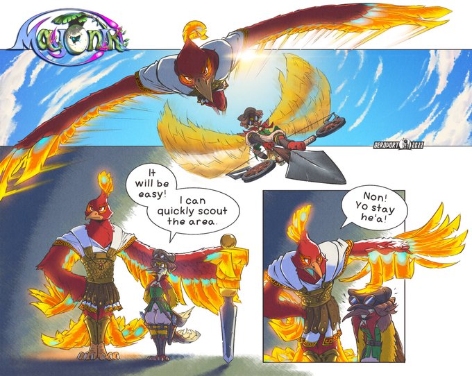 Concept illustration for the author's project #Mayoniki. I already drew her OC Azura last year, now it's Phoenix and Donna's turn. Watch your head, bird attack! 🔥🐦🪶