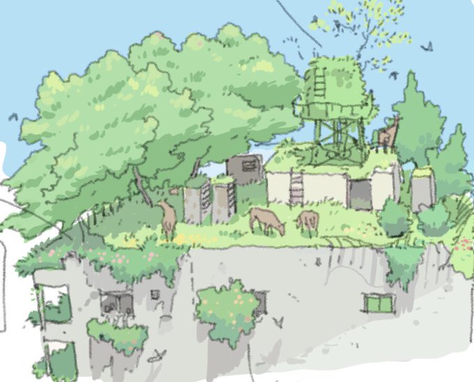 植物が人工物を覆うとめっちゃ神秘的に感じる。こんな景色をもっとアニメで見たい。 #ガラクタ町