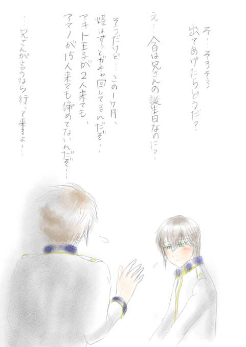 初期のリドの劣等感って、兄にそこそこ似てないと感じないものだと思うんだ。ってなわけで、ラフをコピーしてリドとカランに分けて描いてみた!妄想のみで描くのムズイ…