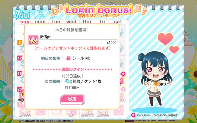 本日のログインボーナスは梨子ちゃんから頂きました🌸