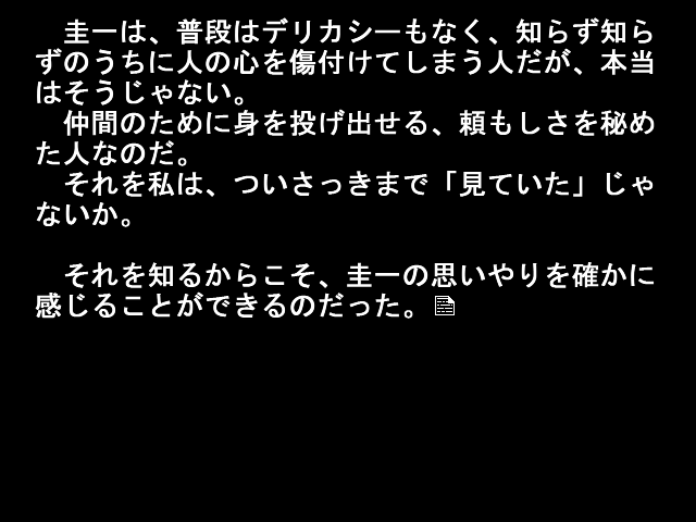 @Farman12We18WdT このシーンは圭一視点ですが、最後の一文だけは圭一の知らない梨花のモノローグなんですよね(小説の作法だと悪手ともされる視点の頻繁な切り替えですが、ビジュアルノベルゲームならではかなと)