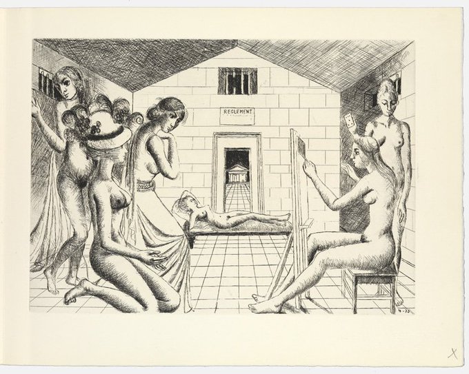 Some of Paul Delvaux's etching for Alain Robbe-Grillet's Building a Ruined Temple to the Goddess Vanadé.