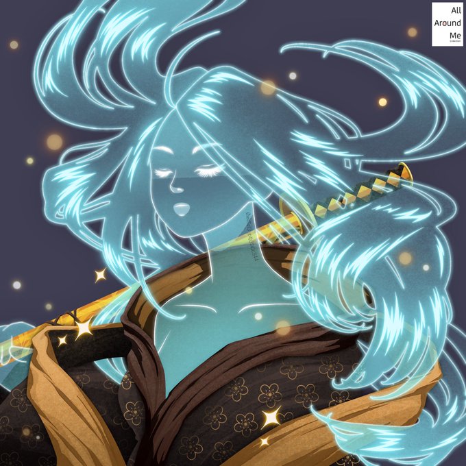 Loved the attention to the color selection and rendering of the hair & sword in this derivative! The purple-light blue-yellow combination palette was effective in centering the Azuki and bringing out an aura for both the character and sword.