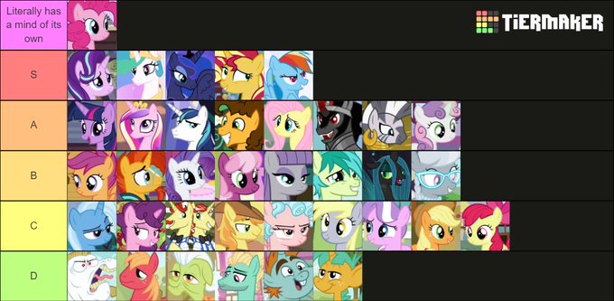And now I made a second tier list, this one of the different ponies and their manes. Who has the most fabulous mane, the ones that fit the character's personality, and everything of the sorts