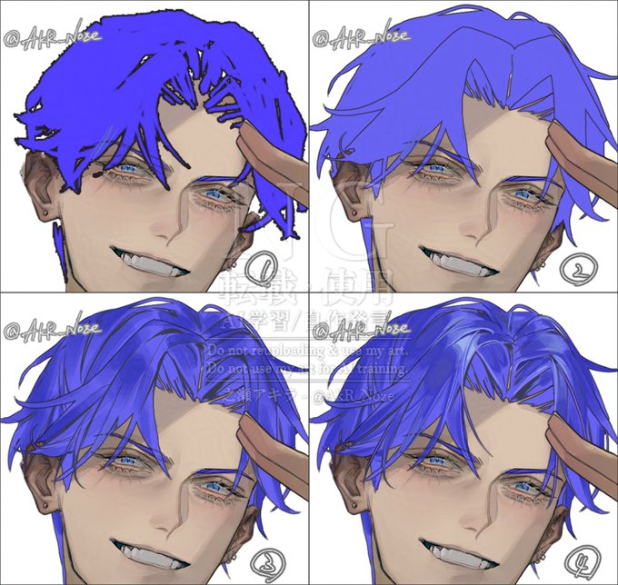 【備忘録髪メイキング】再録 ①初手大ラフ→②下絵→③毛束作り-過去メイキング見ながら塗り込み1→④ハイライトと塗り込み2→ ⑤色調整と塗り込み3→⑥影を入れるも微妙に思えたので→⑦筆を変えて厚塗りを試行→⑧ばらけた毛を適度に足す+最終調整