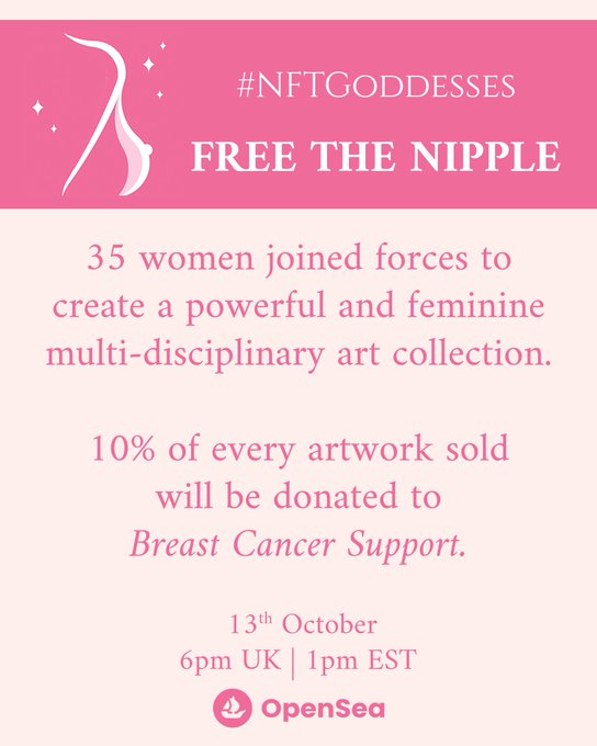 Proverbial bras are dropping right now as the @NFTGoddesses drop the Free the Nipple project!!!! The cherry on top is that 10% of all proceeds from art sold in this collection go to breast cancer support at https://t.co/IIVihiBHRY