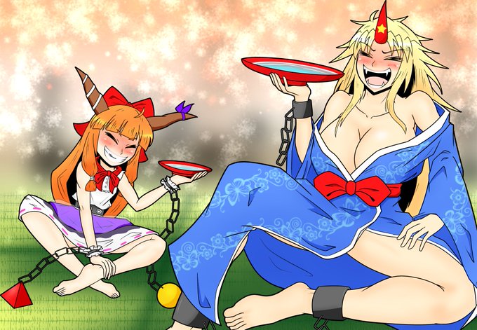 ヤマメちゃんの勇儀さんに変なもん飲ませるシリーズに巻き込まれる萃香さんです。二人とも強いから大丈夫。