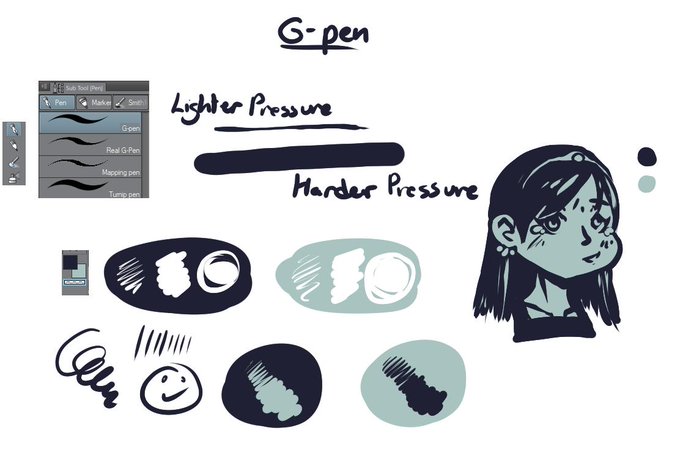 I like how thin how the G-Pen can taper off as you ease off the pressure, easier to do the pointier edges of the lineart/solid coloring. "Real G-Pen" is similar to the "G-Pen" but I like using it for its texture.